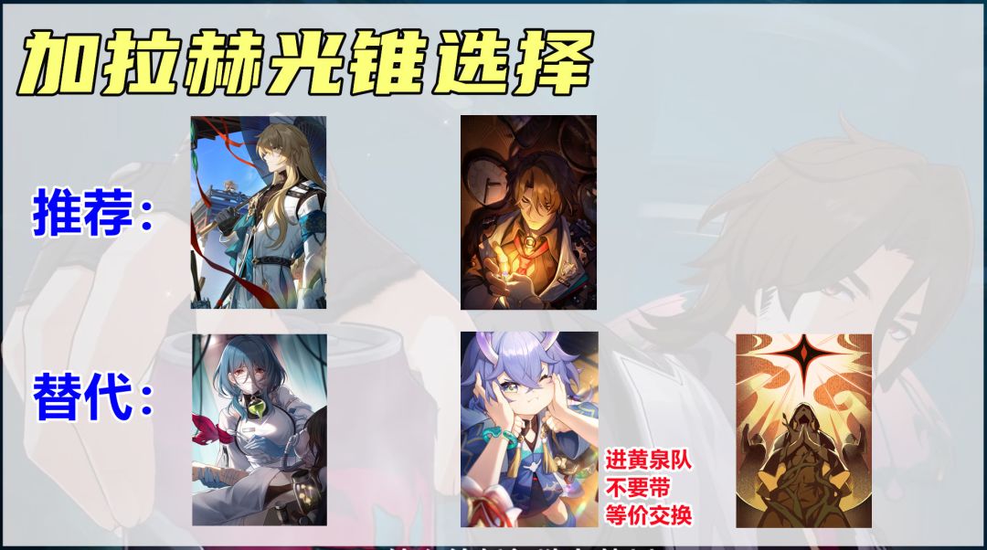 另外还有三个替代光锥,推荐优先度为一场术后对话>等价交换>蕃息。需要注意的是,如果是搭配黄泉,就不要带等价交换了,因为回能经常会被黄泉吞掉且没有效果;至于三星的蕃息,因为加拉赫治疗量不吃面板所以也能用,频繁自拉条在部分场景还有奇效。