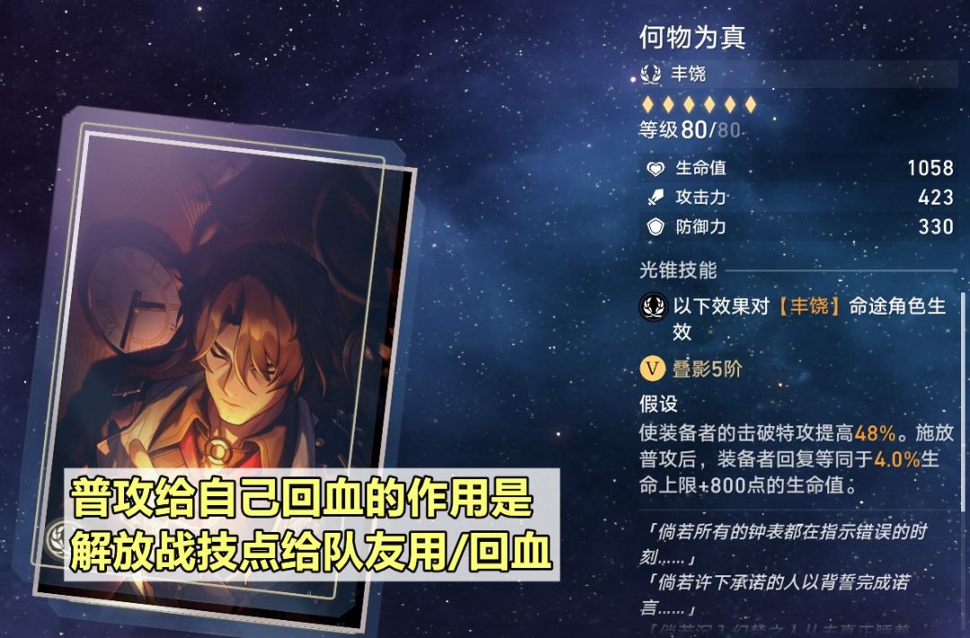 【光锥选择】推荐首选此时恰好,加拉赫能轻松吃满治疗加成,并且配合光锥给的抵抗,再加上自身的小行迹还有星魂1效果,能轻松做到百分百抵抗。如果没有此时恰好,则推荐商店兑换的何物为真,能加击破和给他自己回血,从而省下战技点,或者用这些战技点来给队友回血。