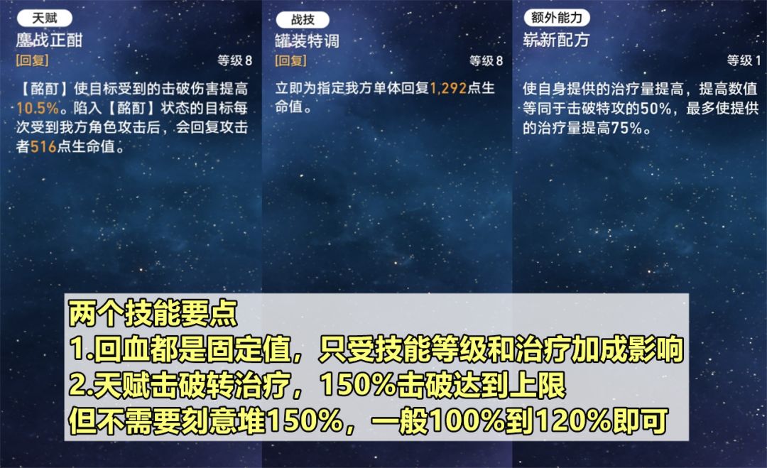【技能要点】技能有两个要点需要注意下:1.战技和天赋的回血都是随技能等级提升的固定值,不受生命值或攻击力等加成,但是依然可以受治疗加成;2.额外能力能将击破特攻转化为治疗加成,150%击破达到上限,但一般不需要刻意堆到150%,100%到120%就差不多了。相比之下加拉赫最需要的属性是速度,速度高了才能更快产点和充能开出大招。