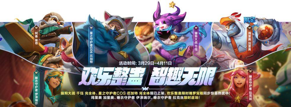 同时,鸡里奥 加里奥、睡衣守护者 伊泽瑞尔、睡衣守护者 拉克丝也将限时返场!活动时间持续至4月11日,快来和他们一起加入整蛊狂欢吧!