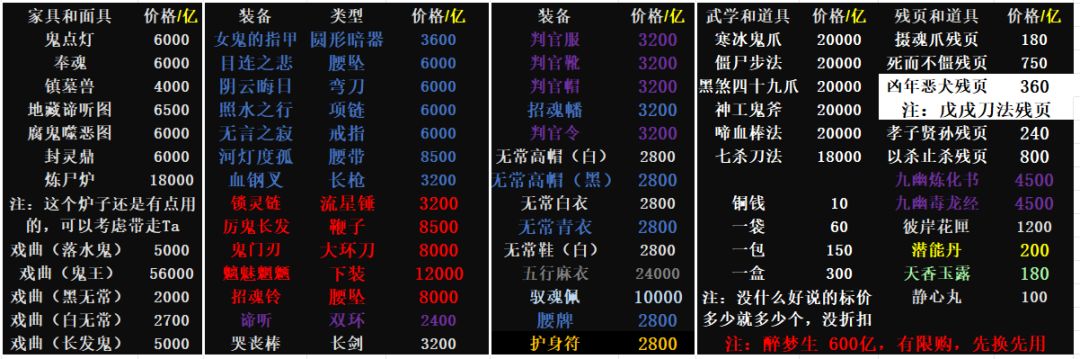 注:武学和个别物件一次性,残页*2/天,装备和面具*1/天,限量道具和不限量书