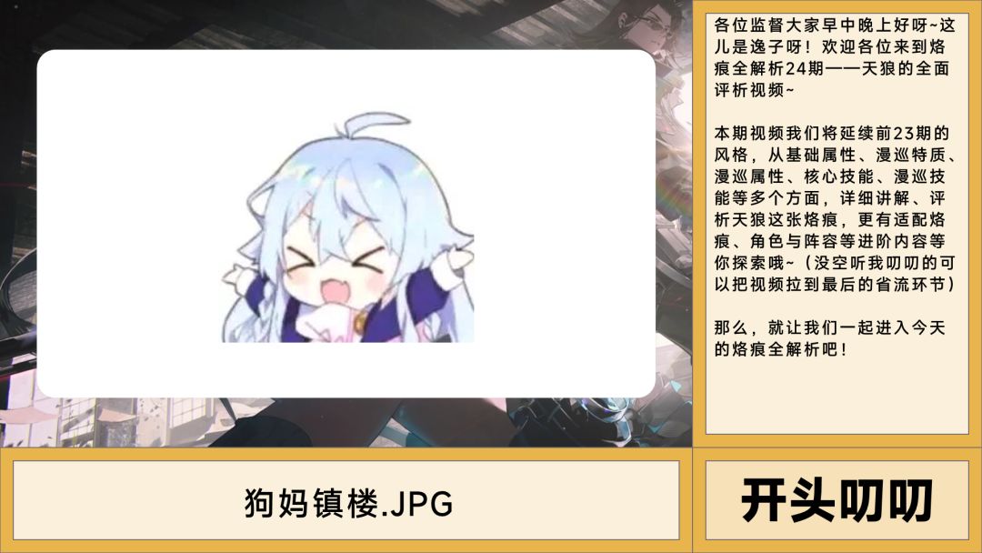各位监督大家早中晚上好呀~这儿是逸子呀!欢迎各位来到烙痕全解析24期——天狼的全面评析视频~