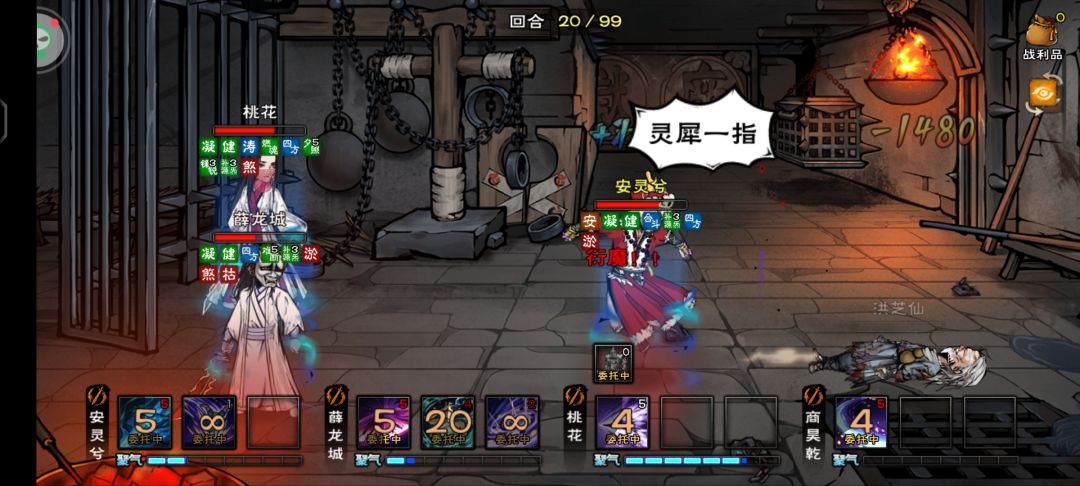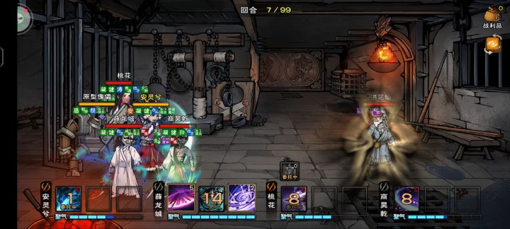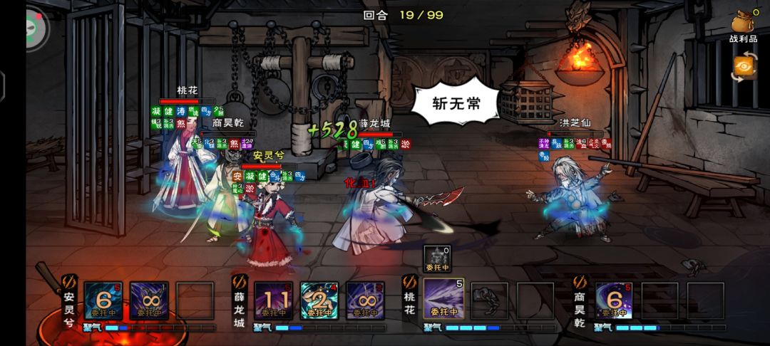 3.思路:调整随从攻击,让主t攻击队伍最高(这里主c带的奶内,不一定站的住,通过调整装备秘技让带天蚕的主T来吃二回合群殴,天蚕在主c身上的小伙伴不用管)。抗过群殴后优先把下路会缴械的棍兵先杀了,群殴会停止。通过机制可以压低小兵血量到30%,洪芝仙会帮我们击杀。杀完小兵或者第8回合进入金针阶段。