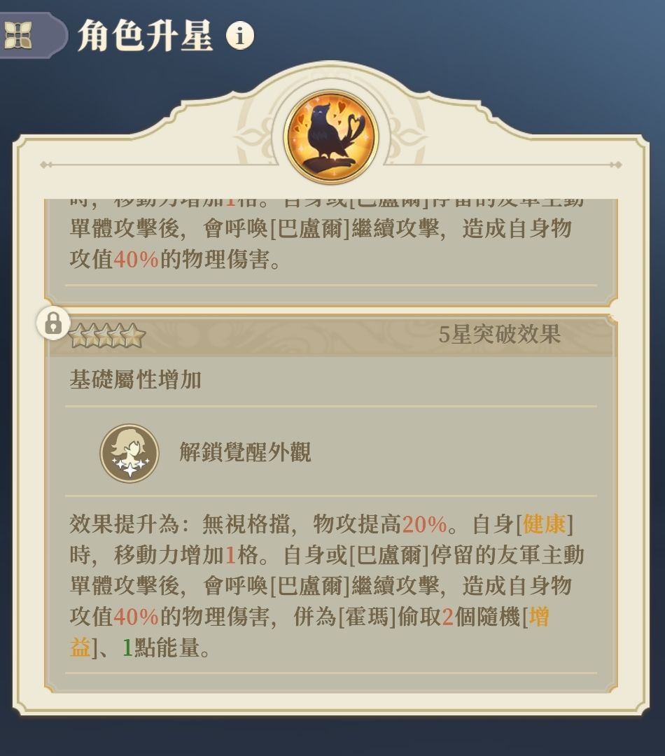 其四:霍玛全游唯一可上降物防3,配合鹦鹉和攻击2和英灵能极大提升奥古斯特输出上限。在上减防的同时还能给怪上致盲,让没有闪避buff的队友也能闪。最后万一奥古斯特还是被打残了,降防3技能可通过抉择变为单体治疗,为奥古斯特提供婴儿般的呵护!