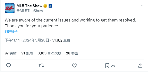 目前《MLB The Show 24》官方已经了解到相关问题的存在,并表示正在努力解决,同时也感谢玩家的“耐心等待”。