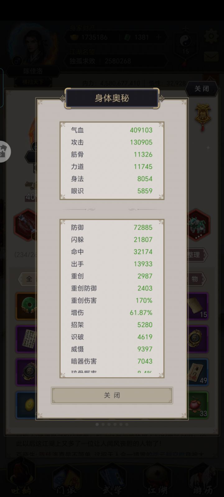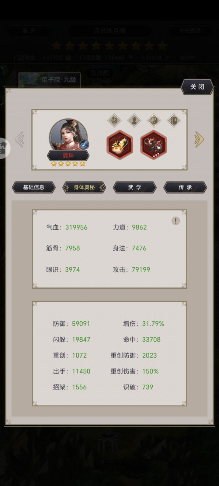 心法是圆转筋骨(力道大于筋骨),套装七杀(2阶4星),暗器飞蝗,破御(腿70,拳刀65,剑62,枪60,棍80破40御)。主动9星都有,横扫逆转封门,幽兰逆转千机,白龙逆转天穹,斗佛逆转唯世,觜宿逆转穷奇。反击51+36。