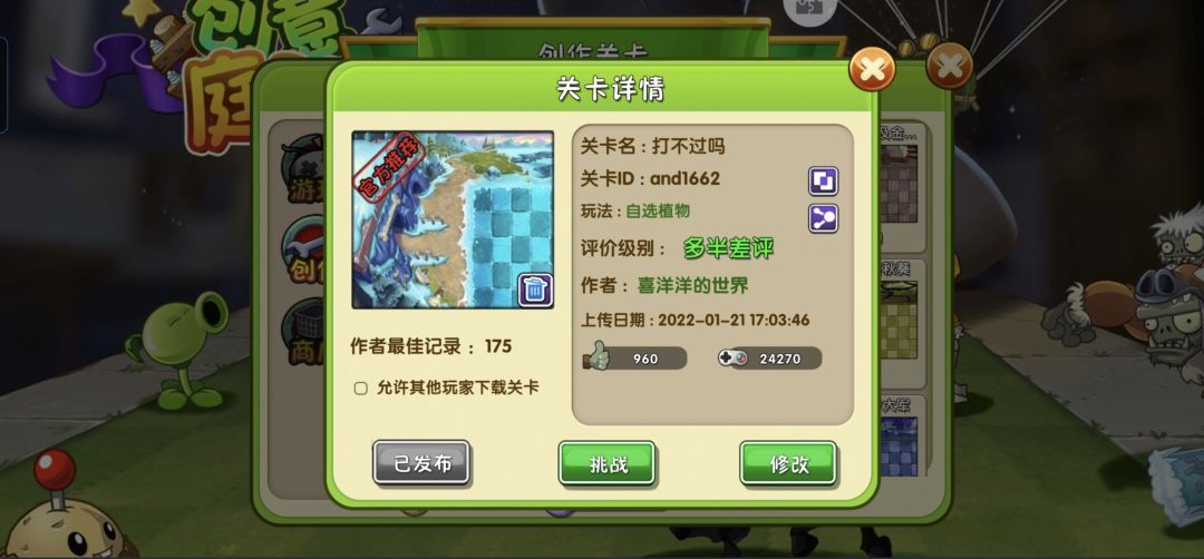 ④随着时间的进程,官方进一步修改了榜单,随机性进一步拉大,周榜更难,平民和个人很难更好的获得紫币,创作仿佛成了唯一的途径。但是还有大型的互赞交流群,他们团结一致,规则严密,多次突破封锁,达到榜单首项,甚至公开展示群号,可是官方从未制止这种行为。游玩已经超过30秒了,有植物有僵尸,还要求什么呢。