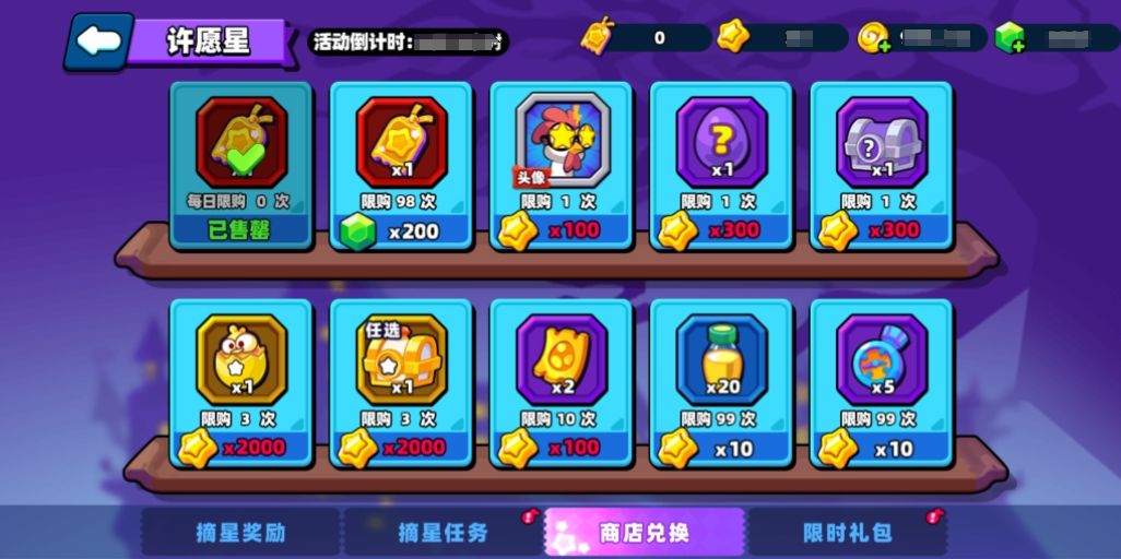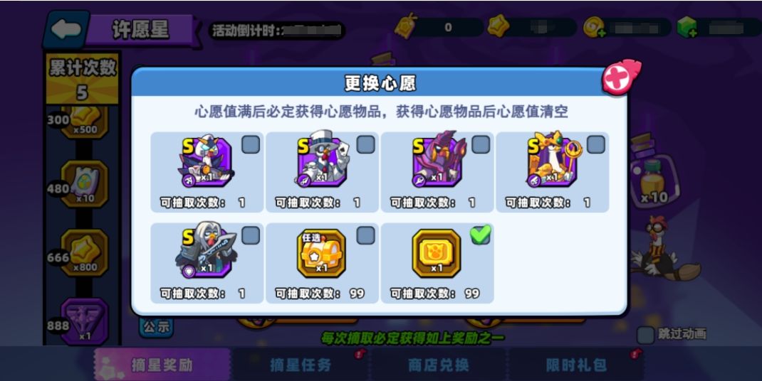 每次摘星都可累计1点心愿值,心愿值满时,摘星必定获得心愿物品,获得心愿物品后清空心愿值