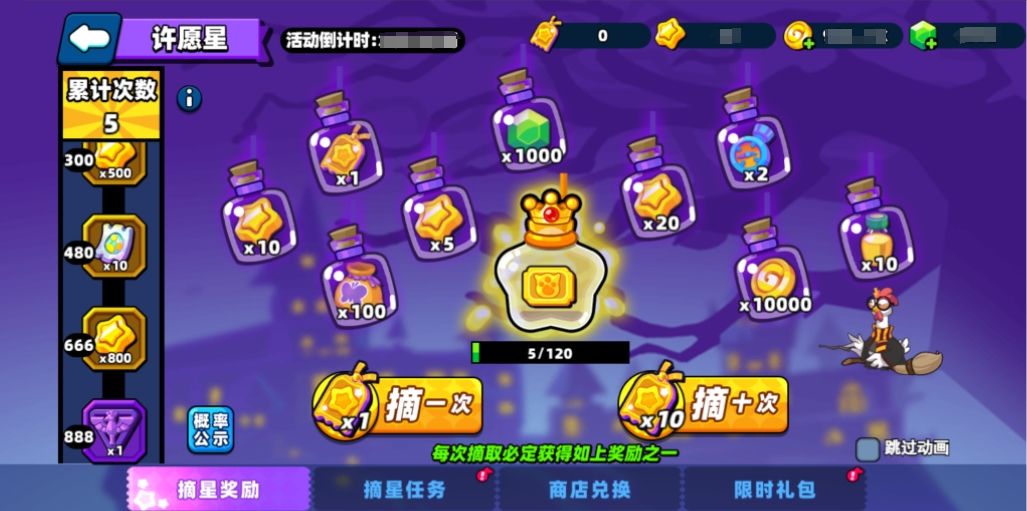累计摘星达一定次数后,可获得对应的次数奖励
