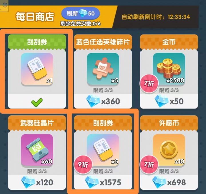 ②每日商店:提供各种英雄碎片、金币、武器硅晶片、许愿币、刮刮券等。