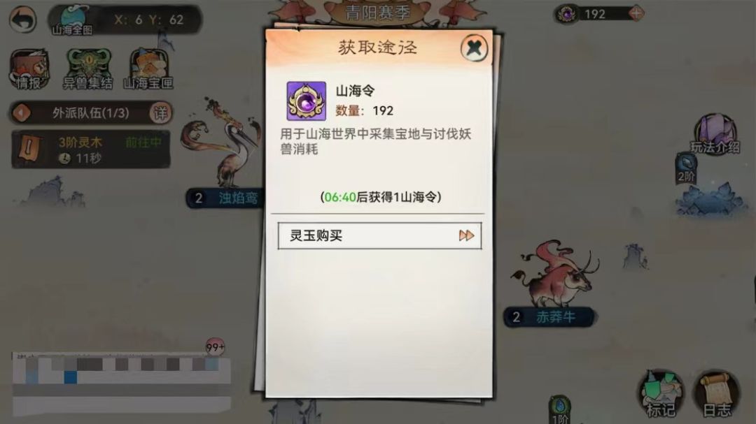 异兽讨伐和宝地采集都需要消耗山海令,与令牌相似,山海令会随着时间进行恢复以及能进行灵玉购买