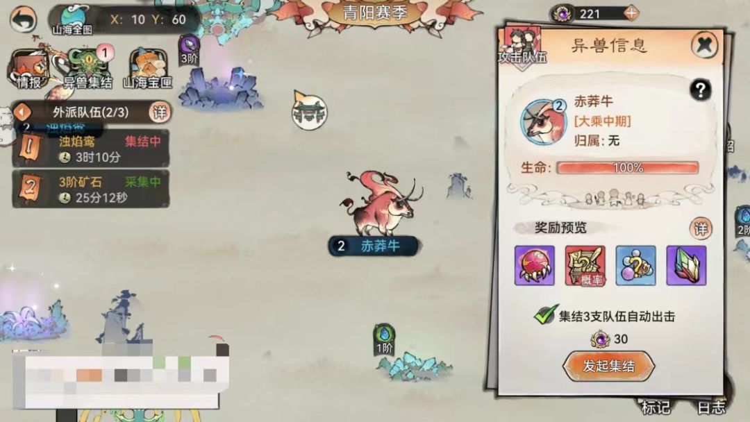 率先发起召集的即为队长,召集时间为限定4小时,最少3支队伍,最多5支队伍,后续可在仙盟谋略中的仙兵列阵提升仙盟最大集结队伍数量至10支队伍,其他祖师可以在异兽集结中加入盟内祖师的队伍