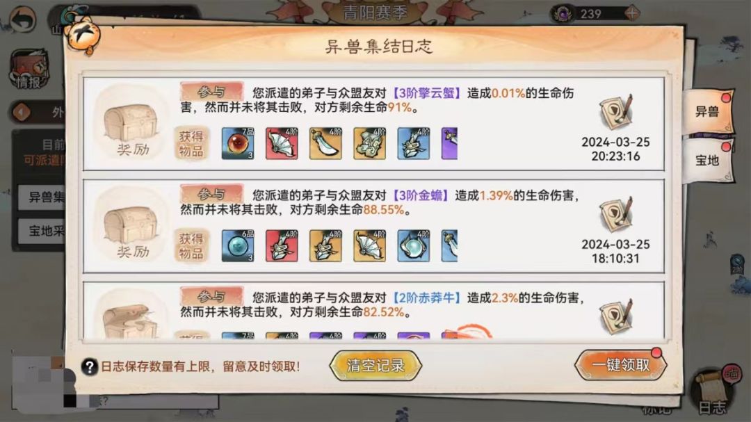 每次派遣弟子对异兽造成伤害时都可以获得妖丹、对应阶别装备、炼体丹药以及五彩原石奖励,祖师可以通过右下角日志进行查看以及领取奖励。
