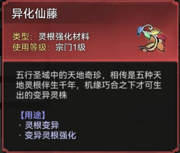 无论是讨伐异兽还是宝地采集都有概率获得道具异化仙藤,可用于弟子的灵根变异以及变异灵根强化,可以大幅度增强弟子的战斗能力