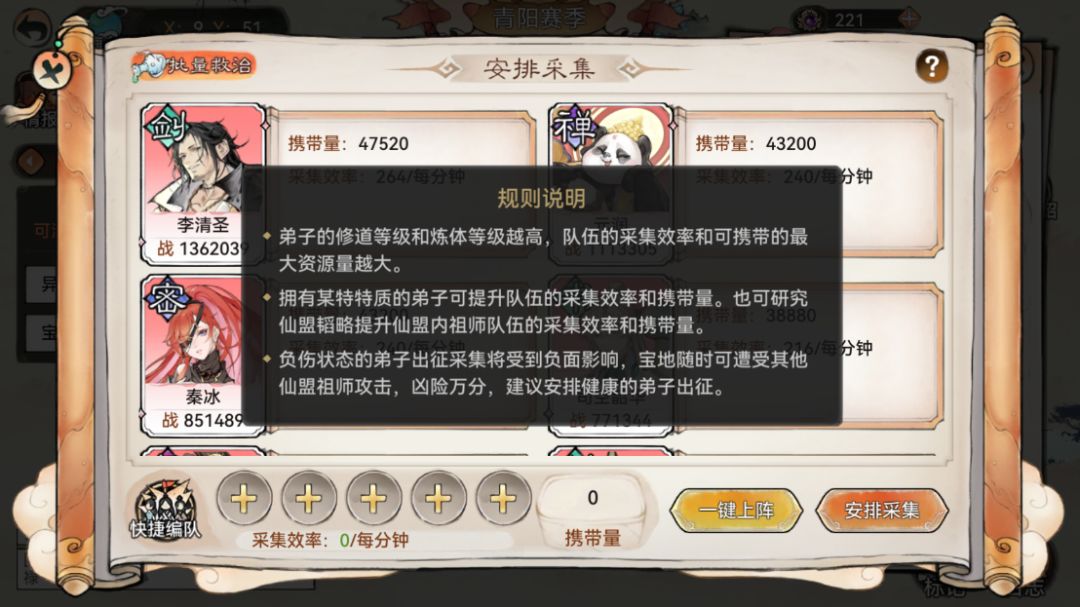弟子采集时的采集效率和携带量跟弟子的修道以及炼体等级成正比,此外弟子特质和仙盟韬略也会影响采集效率和携带量。