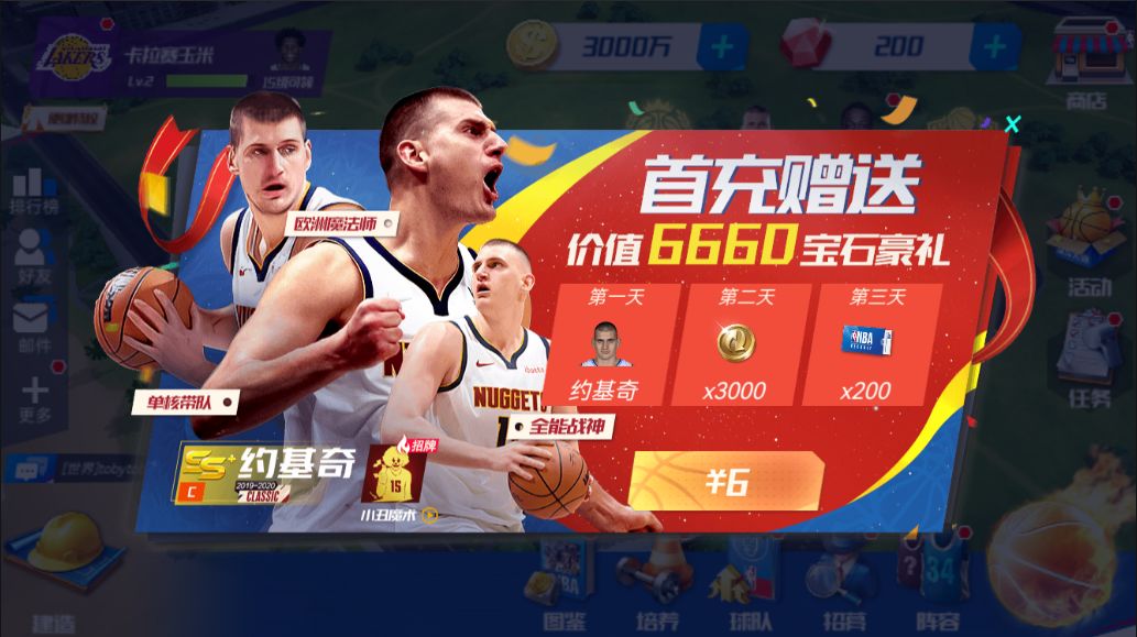 欧洲魔兽,欧洲魔术师,五花肉战神!只需充值六元,约基奇帮你守护内线,更有好多资源等你领取!