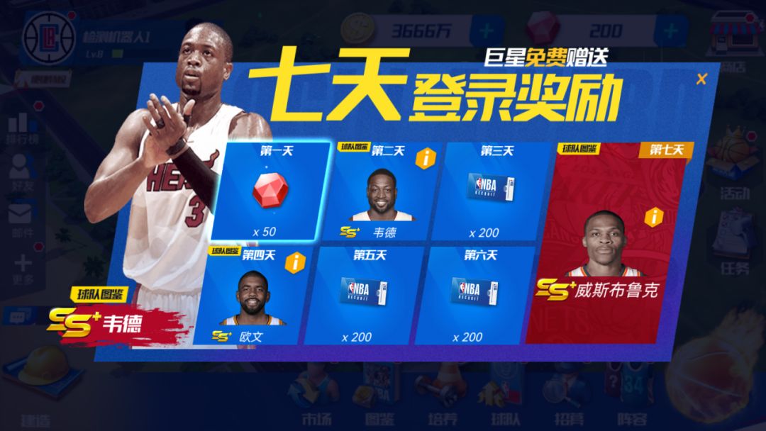 只需登录七天,便可凑齐超级后卫阵容!想知道欧文、韦德、威少在同一支球队打球是什么样的场面吗?快来试试吧!