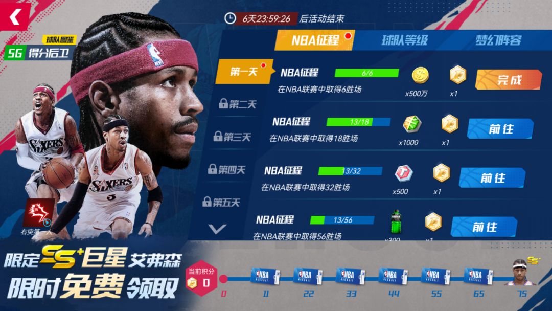 完成每日任务,集满75分便可直接解锁SS+巨星艾弗森!更有超多资源好礼等着您,满满球星招募函让你享受抽卡乐趣!