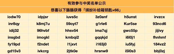 开奖啦!恭喜下列肠肠获得奖励~缤纷补给箱钥匙奖励将会在14个工作日内发放到邮箱,请注意查收!