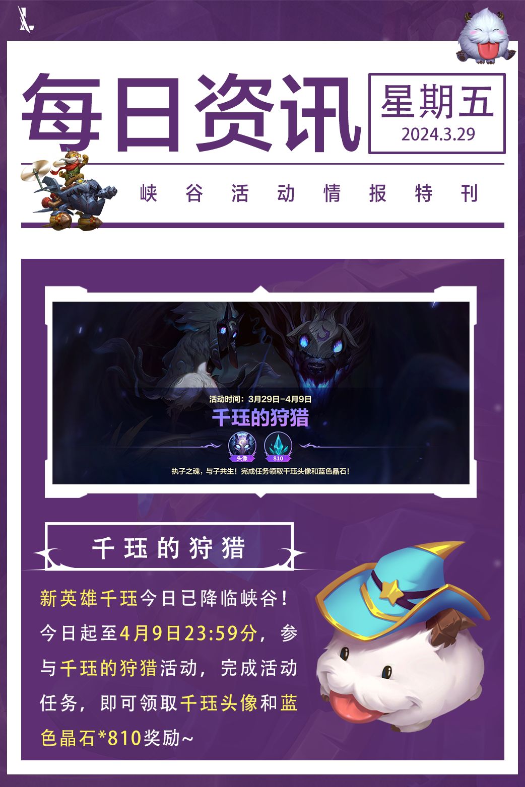 执子之魂,与子共生!加入千珏的狩猎,捕获丰厚宝物。即日起至4月9日23:59分,召唤师登录游戏完成活动任务,即可领取千珏头像及蓝色晶石*810奖励~