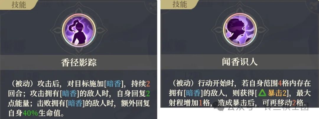 除了个性在敌方于哈斯娜范围内行动结束时能上暗香之外,对于进战前没有暗香的目标,哈斯娜可以通过臂章or火戒,触发香径影踪的被动、来给目标挂上暗香debuff,从而触发相关各类效果。