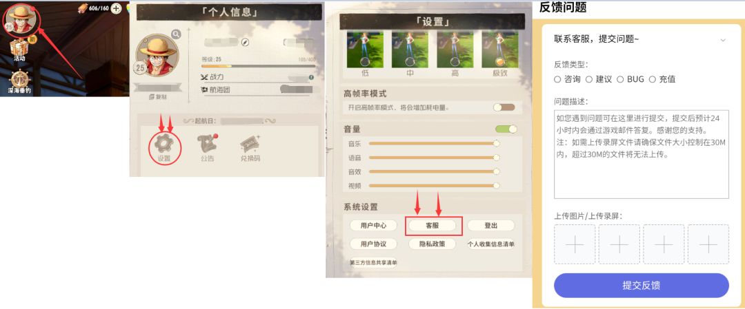 在进入游戏内的情况下,可通过点击左上角的头像—设置—客服的按钮,打开联系客服页面,在该页面将需要咨询反馈的问题直接描述说明,如果有对应的截图或者录屏需要上传也可以添加,该页面不需要各位船长填写过多的信息,只需要选择问题类型+问题详细描述信息即可,是最方便反馈问题的方式哦~