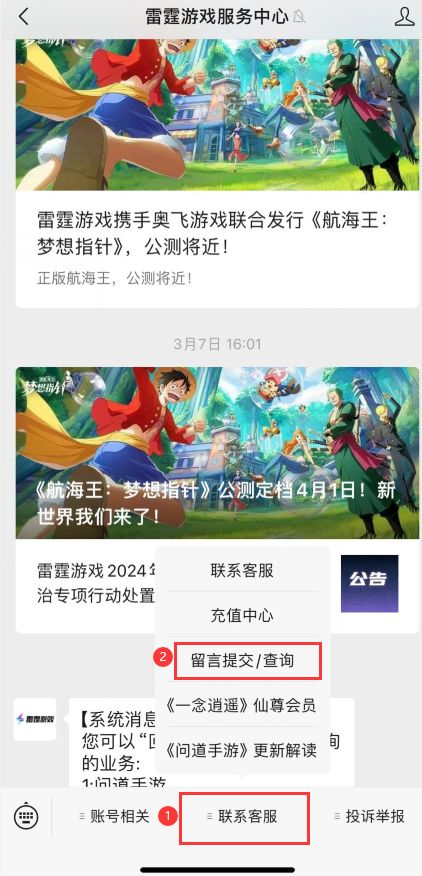 2、关注雷霆客服微信公众号后点击下方的导航菜单联系客服按钮,在弹出的菜单选项中有个“留言提交/查询”的选项,点击进入即可跳转到问题提交页面;