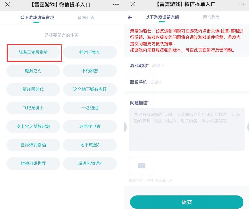 3、进入问题提交页面后,可以看到很多游戏项目,找到《航海王:梦想指针》按钮,进入后则会展示对应的问题提交界面,后面的步骤和登录界面提交问题的流程一样,查看问题提交记录,客服回复结论操作也是一样的,这边就不再重复说明。