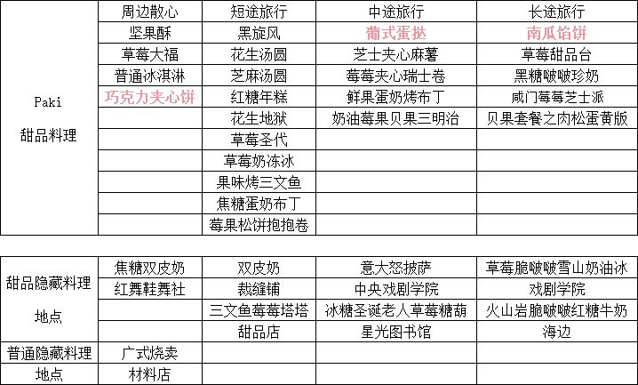 三小只各有各的偏爱,Paki喜欢甜品,Peacoo喜欢西式,Uno喜欢新奇(表格里标其他颜色的料理均可在商城进行购买)