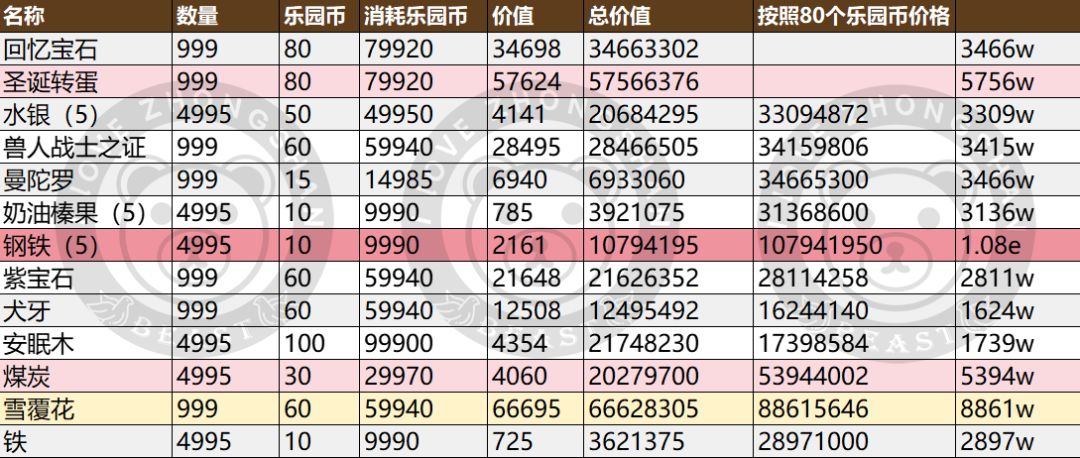 经过我蹲了1个月左右,整理了一份这样的表,暂时来说,性价比最高是钢铁和雪覆花,其次是圣诞转蛋,煤炭。以前兽人证值钱的时候,可以达到性价比很高的,现在就不值得了,希望这份表可以帮到大家,有需要的可以收藏~