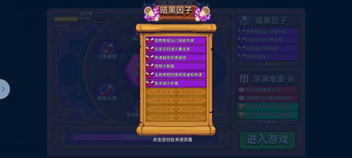 3:特殊减免及特殊词条(透体:怪物有概率无敌,虽然不知道为啥怪无敌叫透体,技穷:释放技能后无法普攻,0盾:每次开局没有盾条,无盾受伤加成,异常加成,金币灵魂掉落大幅减少等等)