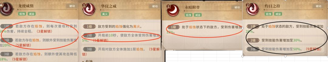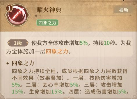 四技能曜火神典:1.开局10秒,全体攻击增加5%