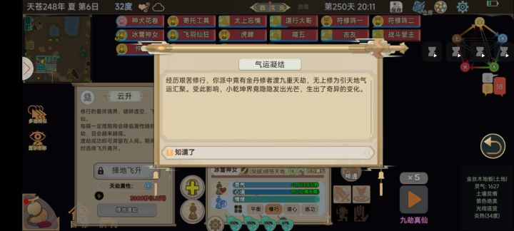 首先想要通关游戏,第一要点就是能存活下来,因为活着才有资格谈以后,怎么样才能活下来了,那就是必须要有一个强力的战斗型大哥,能抗住第80天的妖兽,第150天的神秘人。能达成这两点,这局游戏基本就稳了,后面的渡无限天劫,打门派就是时间问题了。龙洞的话不用担心,只需要注意一点就行,用大吉房间镇压后,龙洞会触发一些天气,导致房间不再是大吉,从而镇压不住,出现异常天气时,这里需要有人第一时间放驱云决,抵消负面天气。