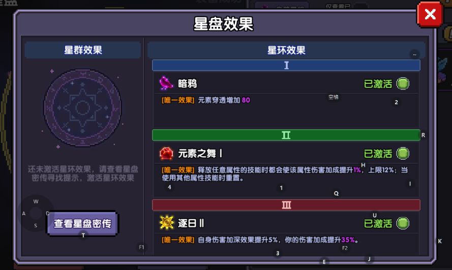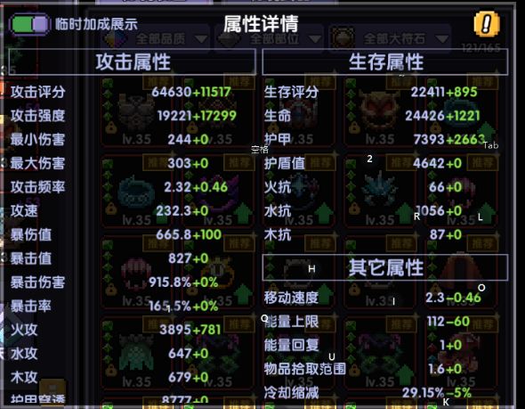 未标注的两个区域在大秘境130-140的buff里有这几项要求,当然每一项都达成是比较困难的,可以调节暗金选择及根据自己的暗金洗练的出攻强/属攻/暴击值/护穿外的第三属性,和符文结晶的两块区域自行搭配组合,达成其中1~2项要求应该是不难的。