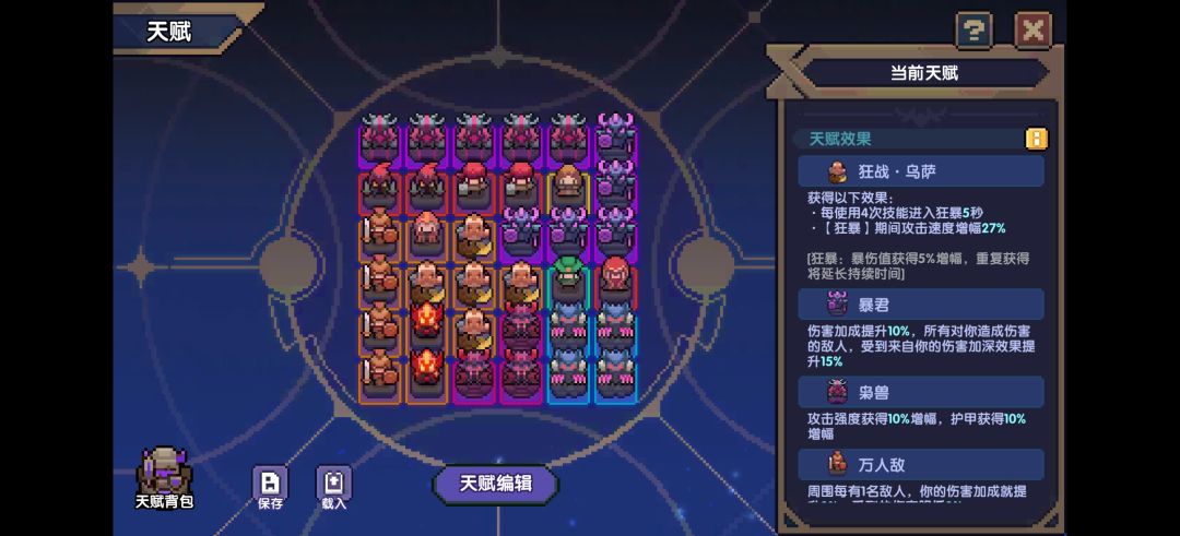 当然对群的核心天赋主要为血帝·奥索及万人敌,血帝用来杀敌续战士狂暴,万人敌,一个敌人单位为你增加3%的全伤,也就是怪物越多加成越多。当然天赋可以根据自己的面板自由搭配以满足关卡的需求。此外,浮游炮由于需要4.0的攻频要求,所以狂战·乌萨也是必带的,可以大大缓解魂卡攻速压力。