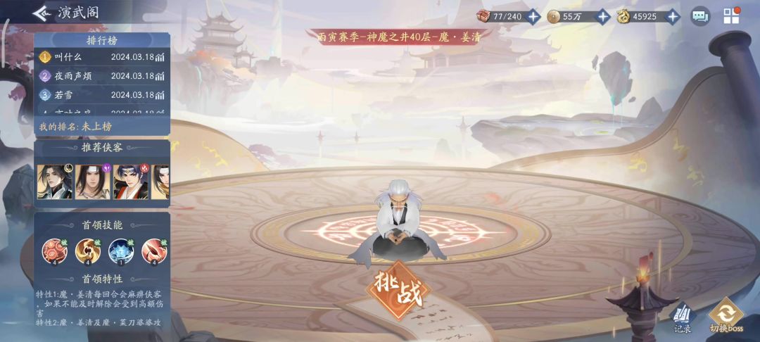 阵容推荐越今朝+李忆如+输出+水阿奴+紫萱+大灵儿或者王蓬絮,至少前排运道,全员更好,输出方式有三种,外伤伤害,越今朝在场时携带外伤目标每被攻击一次就掉7%血量(不超过越今朝300%攻击)和清辉伤害,因为boss有150减伤,其余伤害可忽略不计非常低,运道的作用就是多次触发攻击来增加后两者伤害方式的触发频率。现在疑似火雪见闪避无法清除debuff,不然可以研究火雪见一号位的打法。(我没拉越今朝,所以只能借鉴大佬的通关视频)