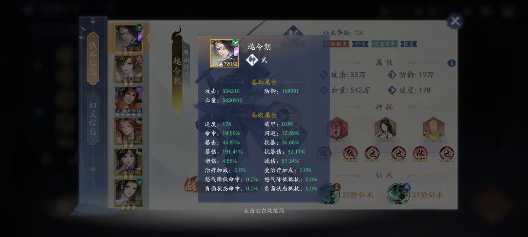越今朝可担任前排,后排三输出都行,比拼必备越今朝,重要属性依然是闪避。