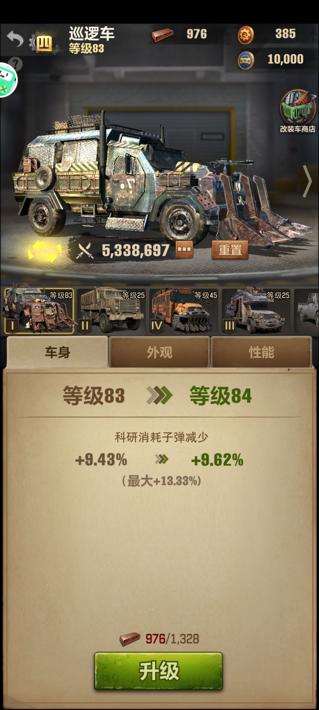 实力提升之改装车:改装车分为3个等级,T0改装车有巡逻车,重型卡车,T1改装车有房车和校车,T2等级有皮卡车。