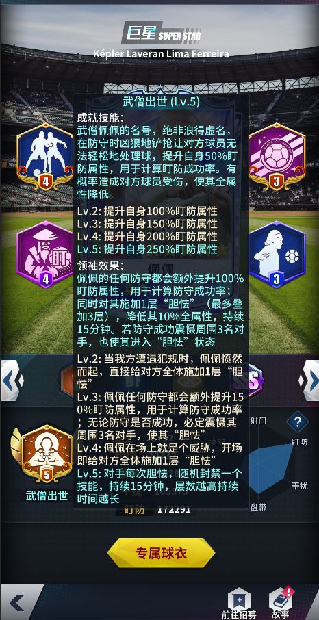 武僧佩佩的名号,绝非浪得虚名,在防守时凶狠地铲抢让对方球员无法轻松地处理球,提升自身50%盯防属性,用于计算盯防成功率。有概率造成对方球员受伤,使其全属性降低。