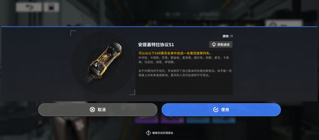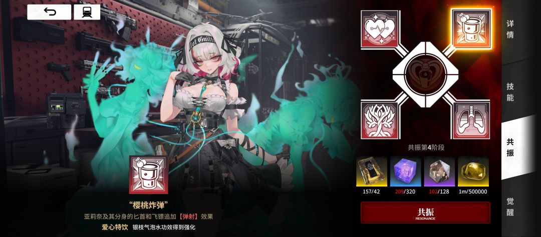 共振:消耗材料解锁角色的其他卡牌效果,消耗的材料都是路上怪物和铁安局刷取获得,也可以在黑月商店兑换,ssr和sr共5振,r和n卡只有4振,五振后会解锁新的立绘
