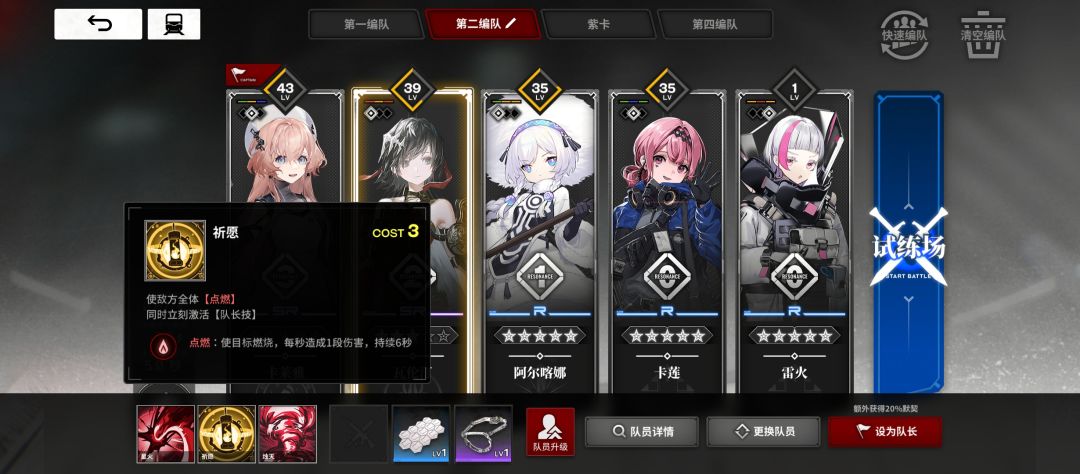 队长位给到卡莱雅,点燃比较简单,主要依靠卡莱雅的队长技和瓦伦丁的祈愿