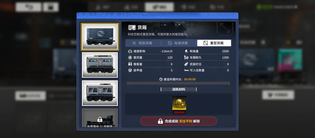 关于重型货车,需要解锁成就无往不利后才能消耗300w制作,比普通货箱高20载货量,后期肯定是要升级的