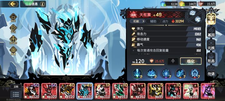斧头(体力暴怒元核) 小基因+40攻击,大基因+100移速,舍弃霸气拉满1500移速,优先点满技能。