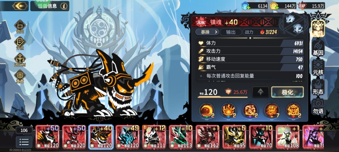 幻(体力稳固元核),小基因+120体力,大基因+100速度,幻不用怎么练,拉高血量打出技能清掉魅妆无敌buff就行。