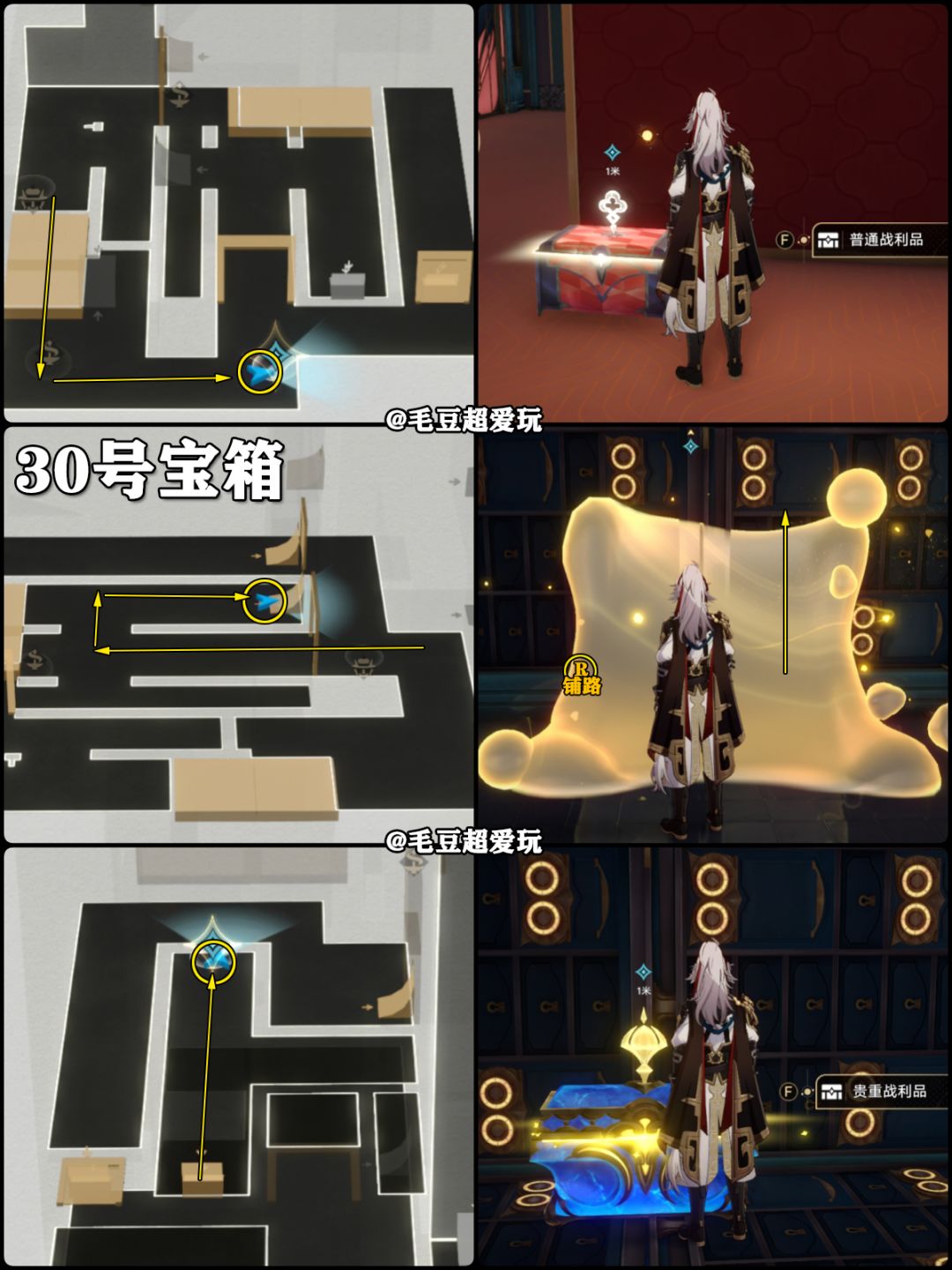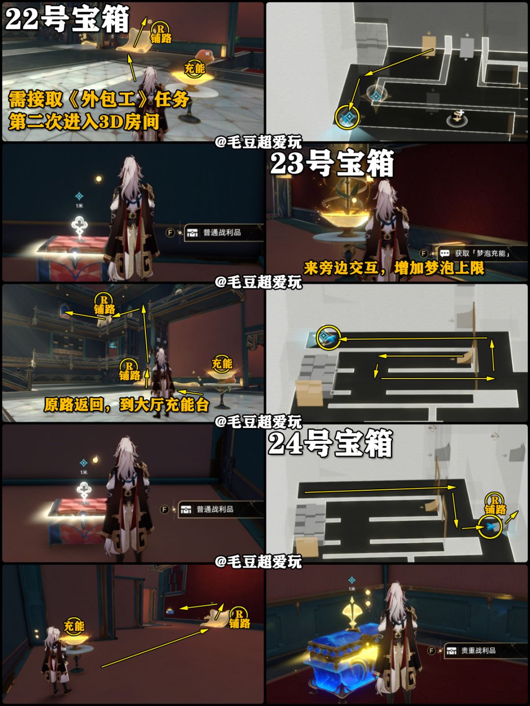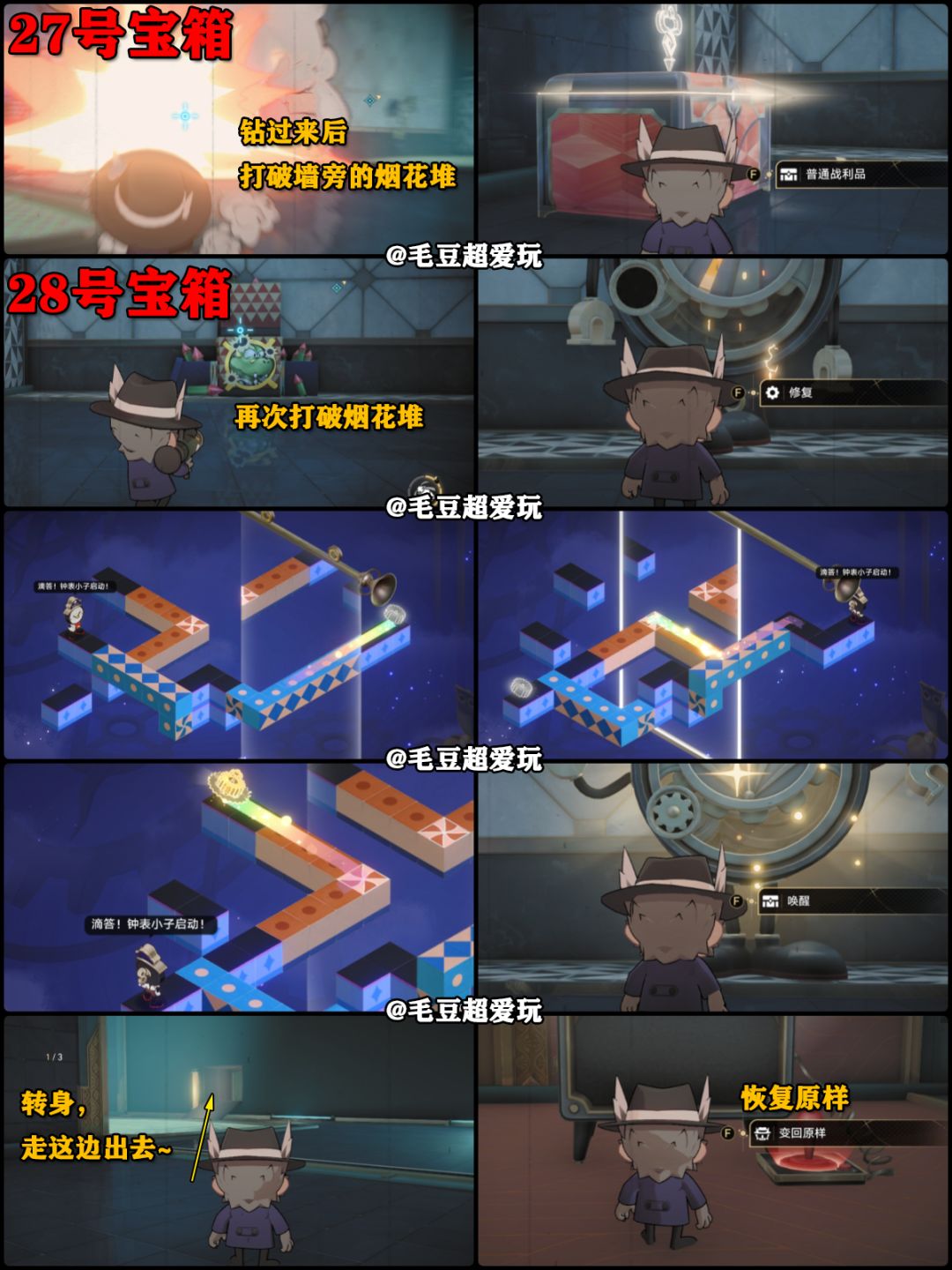 开拓者需要优先完成系列开拓任务《鸽群中的猫》,进行该任务时自动开启地图朝露公馆,如果目标点位没有宝箱则代表已经领取。毛豆根据颜色划分了宝箱类型,钟表谜题、任务宝箱均不计入地图左上角显示的战利品。《外包工》在完成开拓任务后,通过短信接取。