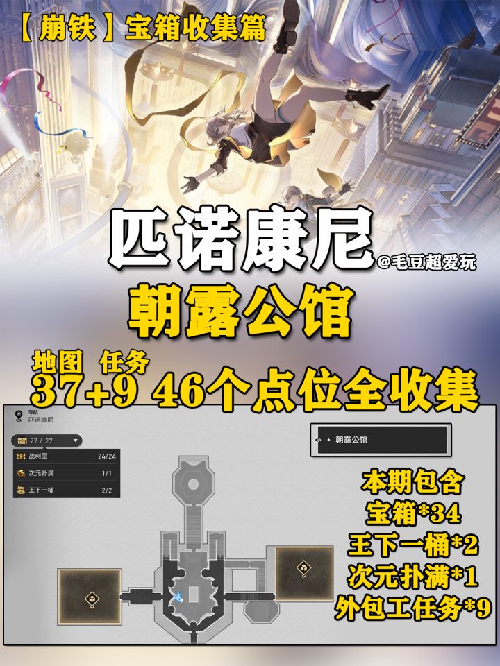 开拓者需要优先完成系列开拓任务《鸽群中的猫》,进行该任务时自动开启地图朝露公馆,如果目标点位没有宝箱则代表已经领取。毛豆根据颜色划分了宝箱类型,钟表谜题、任务宝箱均不计入地图左上角显示的战利品。《外包工》在完成开拓任务后,通过短信接取。