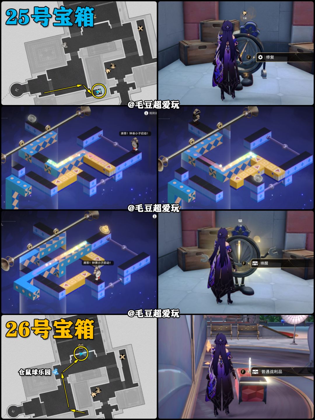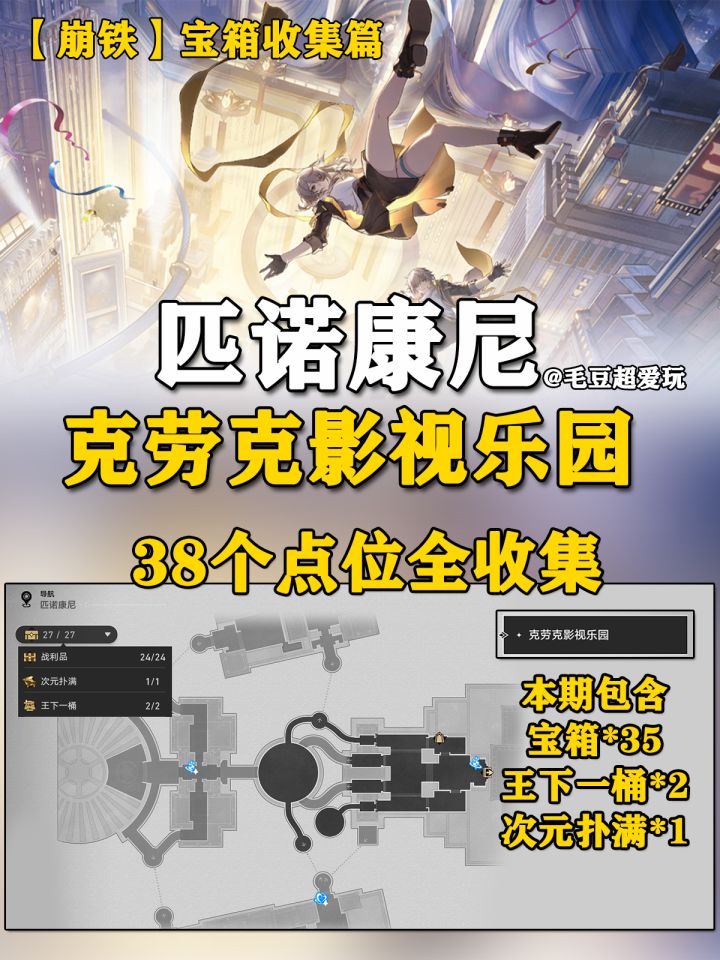 开拓者需要优先完成系列开拓任务《鸽群中的猫》,进行该任务时自动开启地图克劳克影视乐园,如果目标点位没有宝箱则代表已经领取。毛豆根据颜色划分了宝箱类型,钟表谜题、任务宝箱均不计入地图左上角显示的战利品。