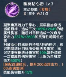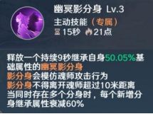 02幽冥极梭:AOE持续伤害技能,造成暗属性伤害,伤害不高但可以配合幽冥影分身技能对多个目标产生伤害,吸引仇恨,再配合含怒增伤群体伤害效果,直接输出爆炸,特别适合爬塔。