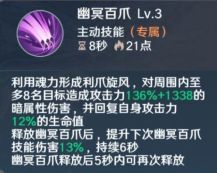 3.核心魂技介绍01幽冥刃:AOE单次伤害技能,并造成暗属性伤害,附带回血效果,突刺也可以当成一个位移使用,本身技能冷却较快,是比较适合过渡的技能。