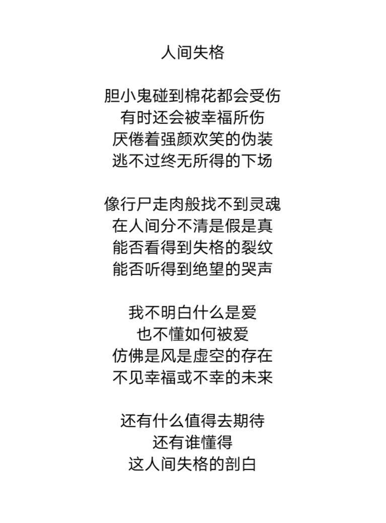 当然,因为我从初中开始一直是写古体诗词的,这是我第一首现代诗词,加上那段时间也很空洞,所以只是寥寥写了一下人间失格里的空洞感,就当做歌词是空洞本身吧。
